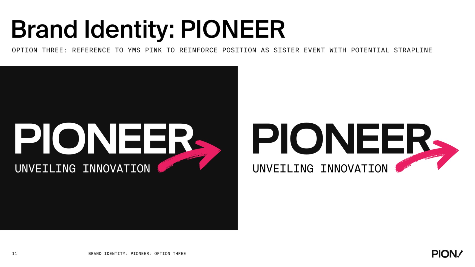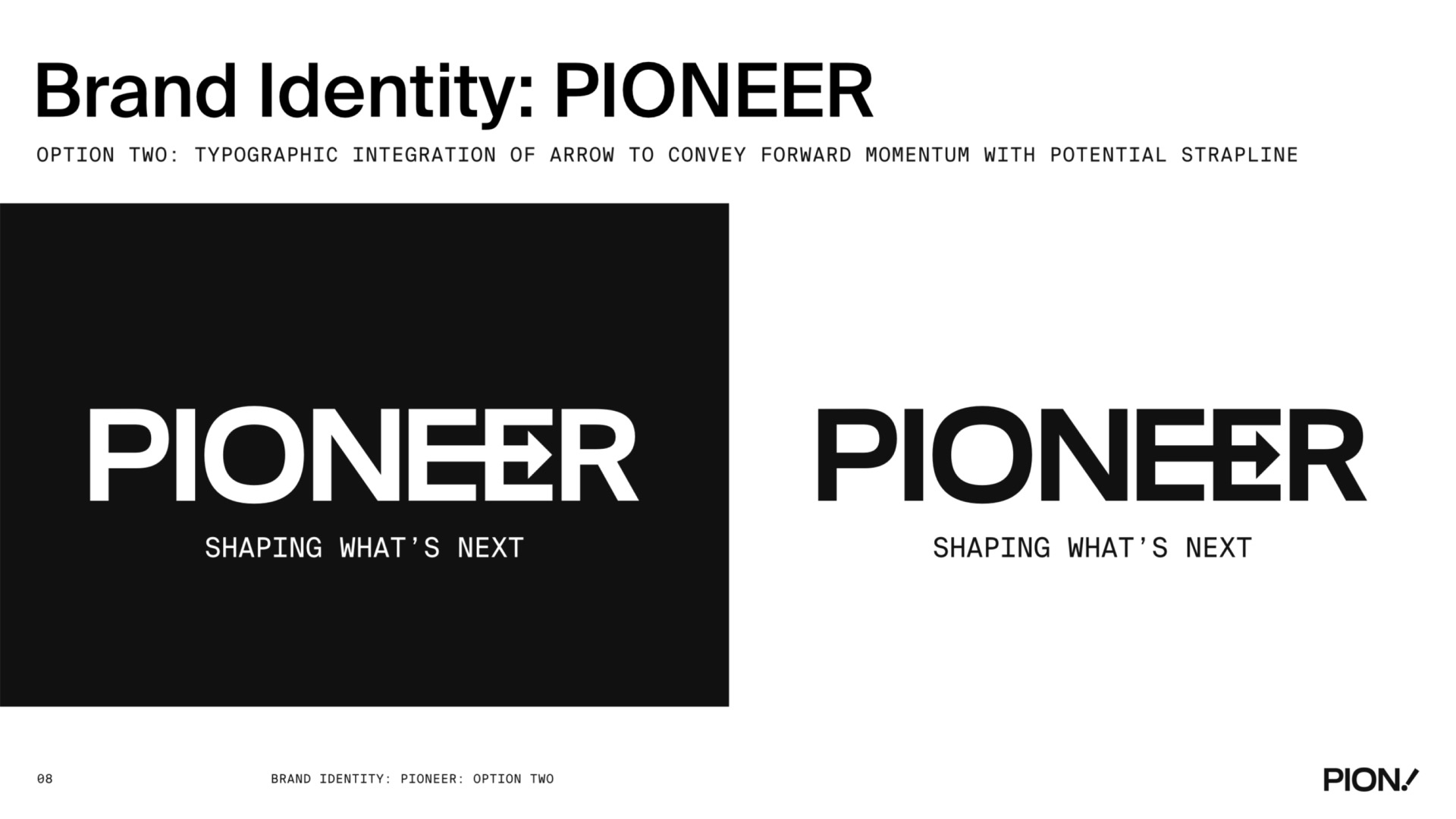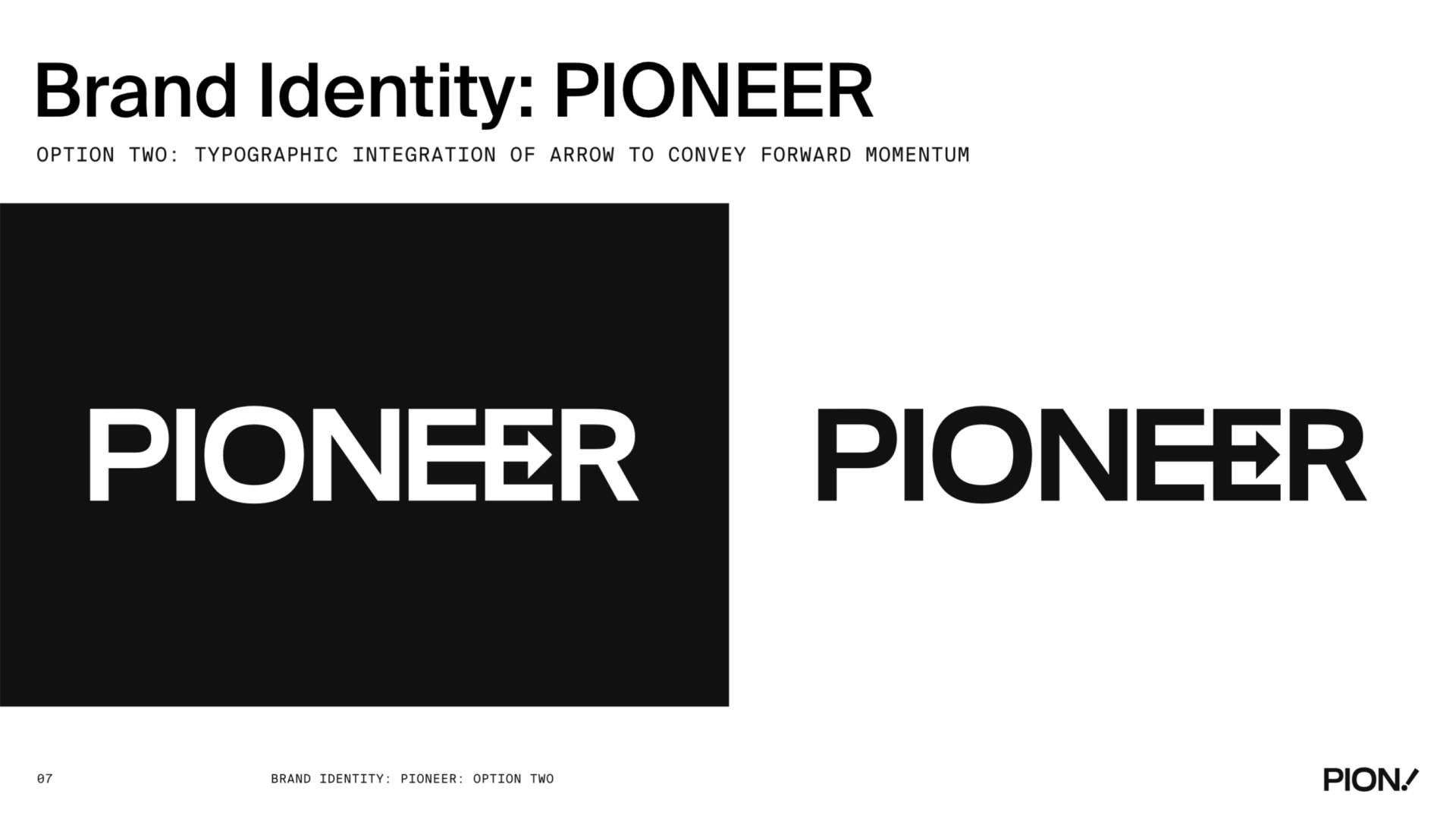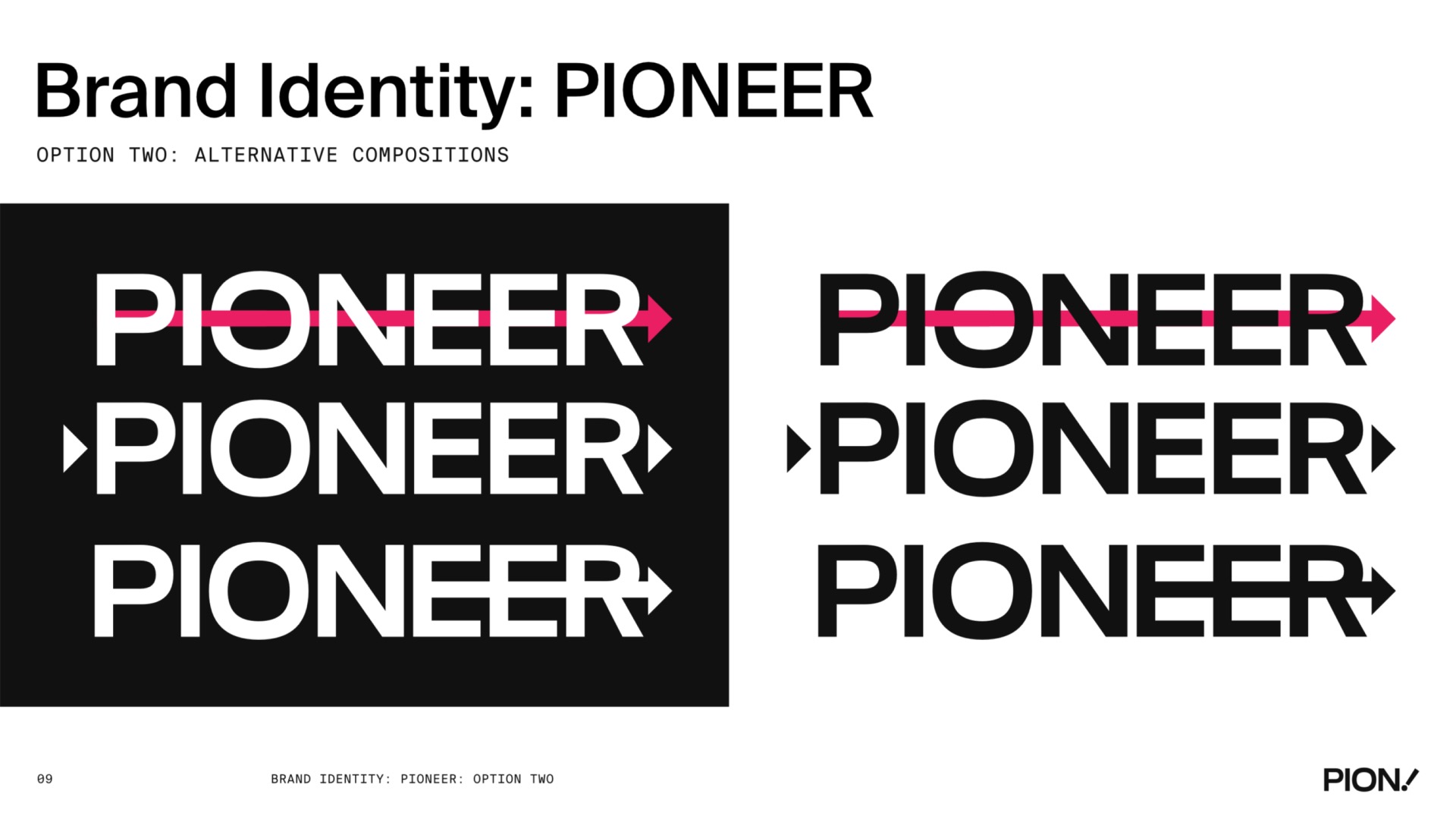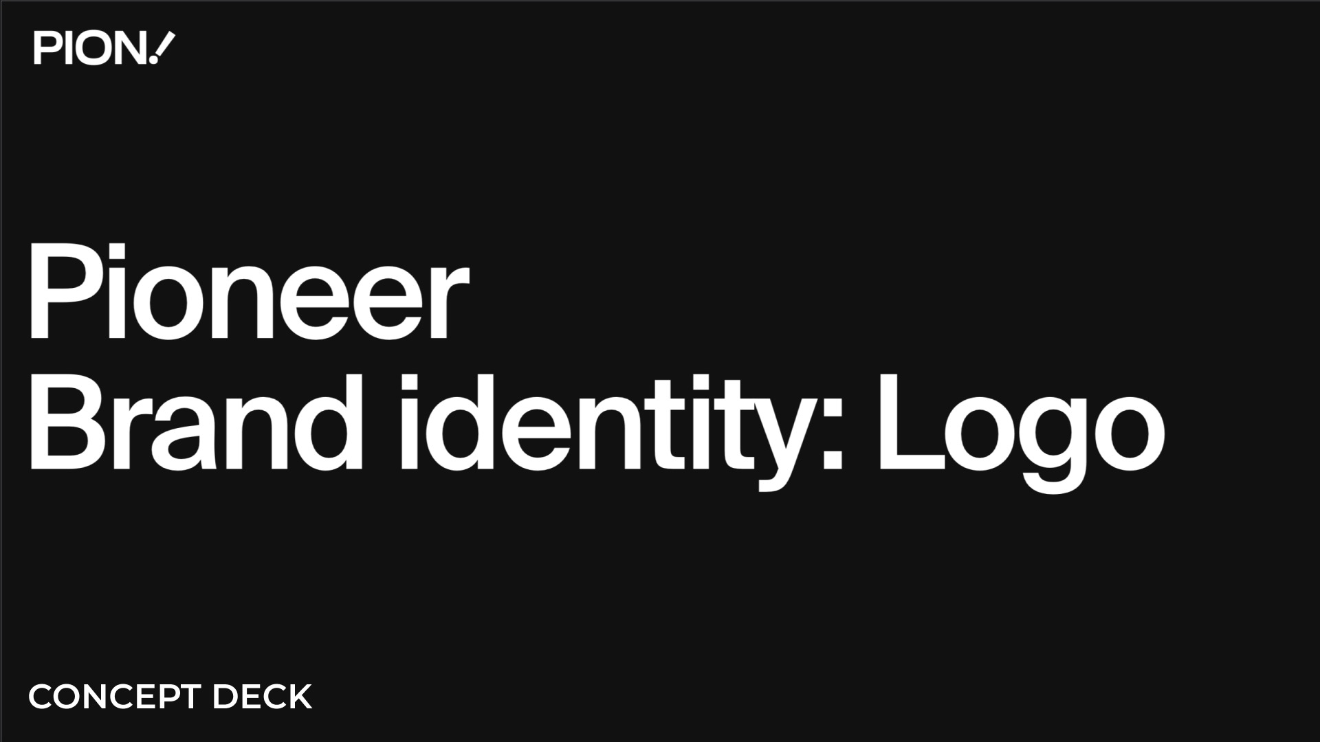 A comprehensive brand identity design for PIONEER, featuring logo design, brand guidelines, colour palette, typography, and visual system applications across various touchpoints.