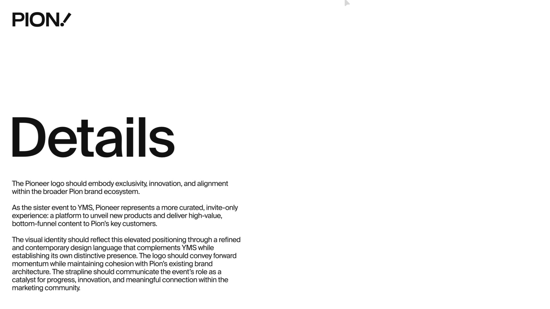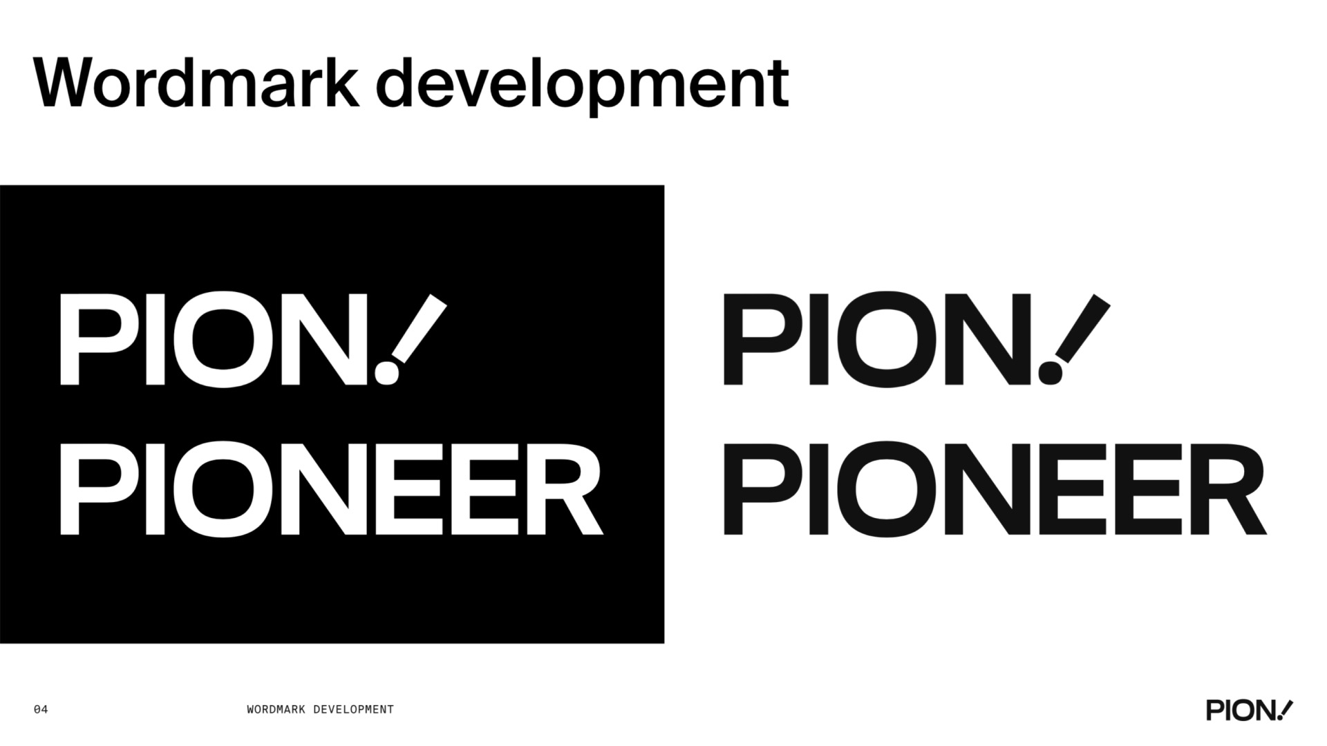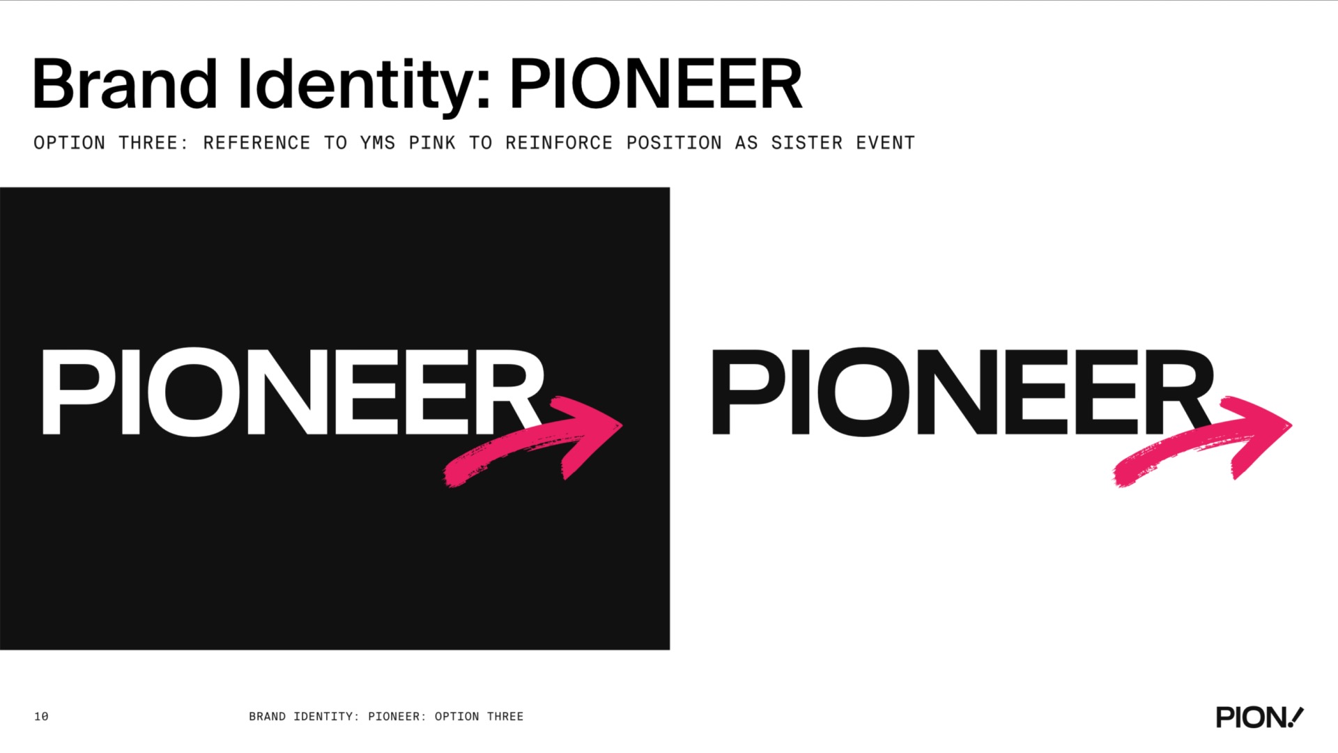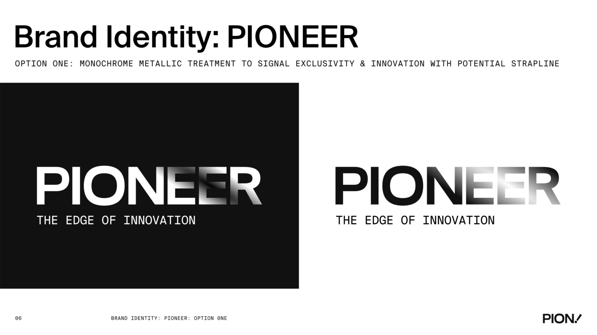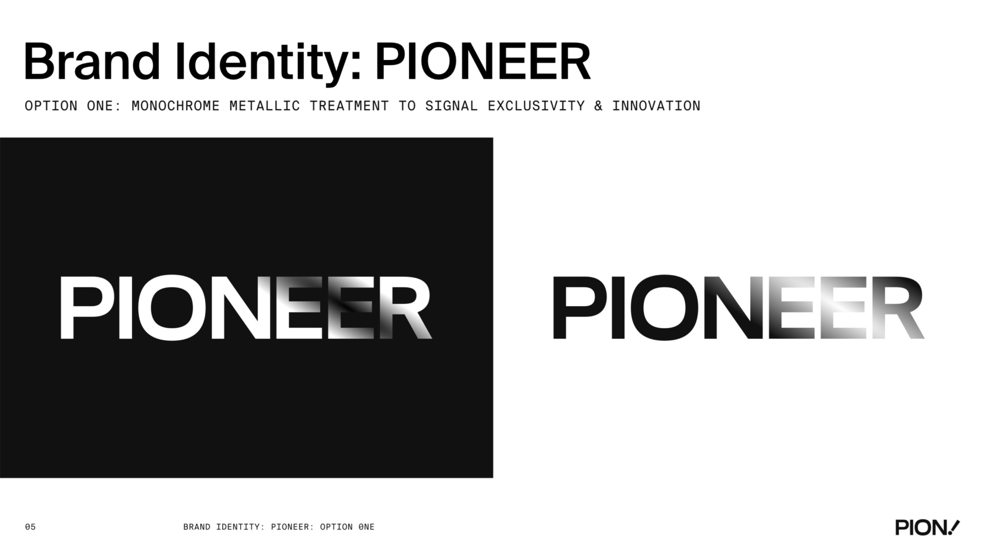 A comprehensive brand identity design for PIONEER, featuring logo design, brand guidelines, colour palette, typography, and visual system applications across various touchpoints.