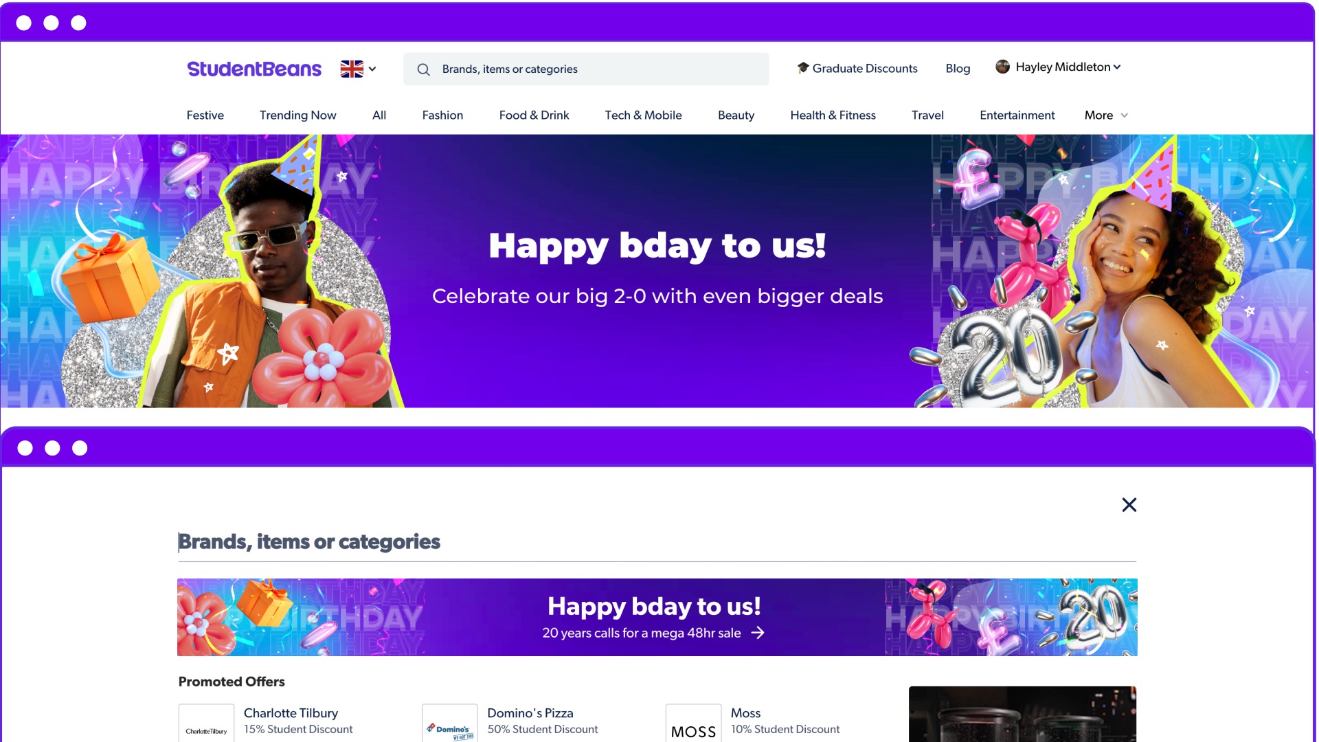 A digital campaign celebrating Student Beans' birthday with vibrant visuals and animated content designed to run across web, app, and social media platforms.