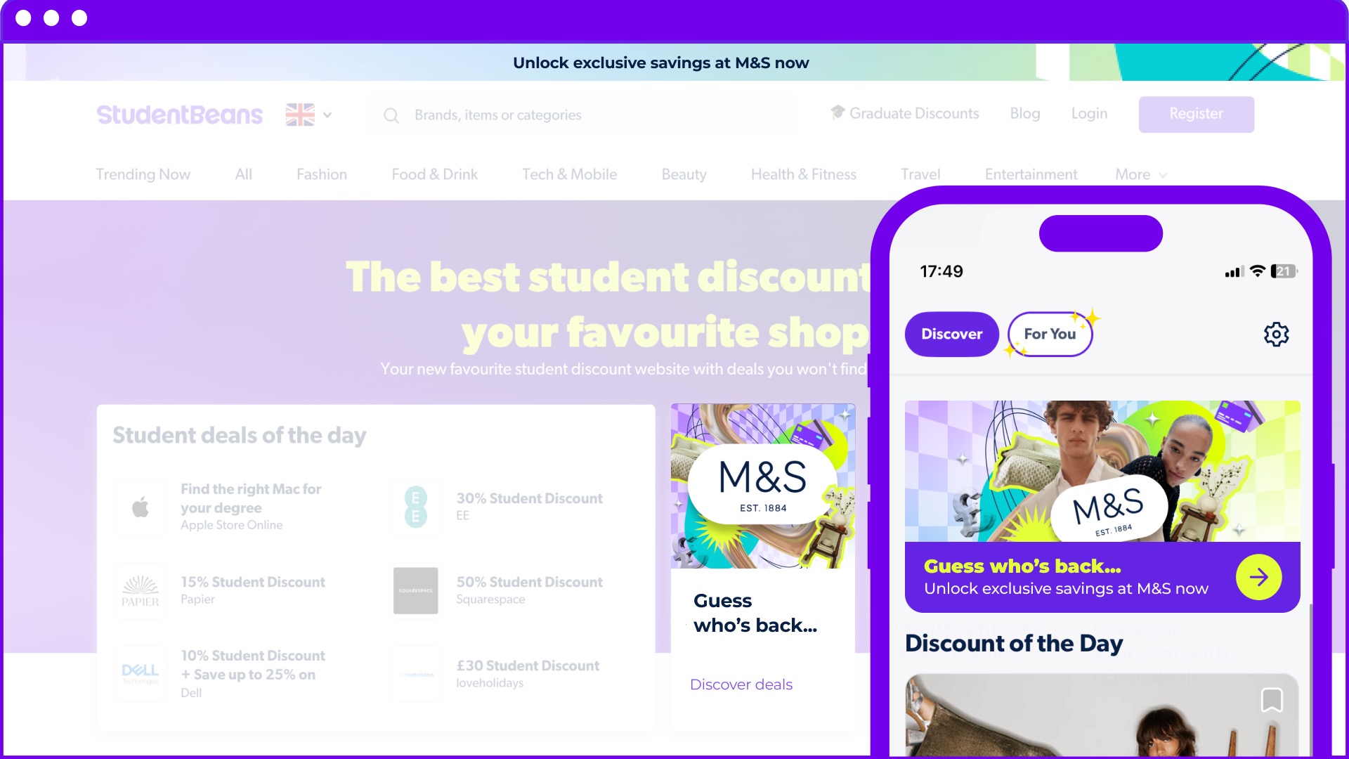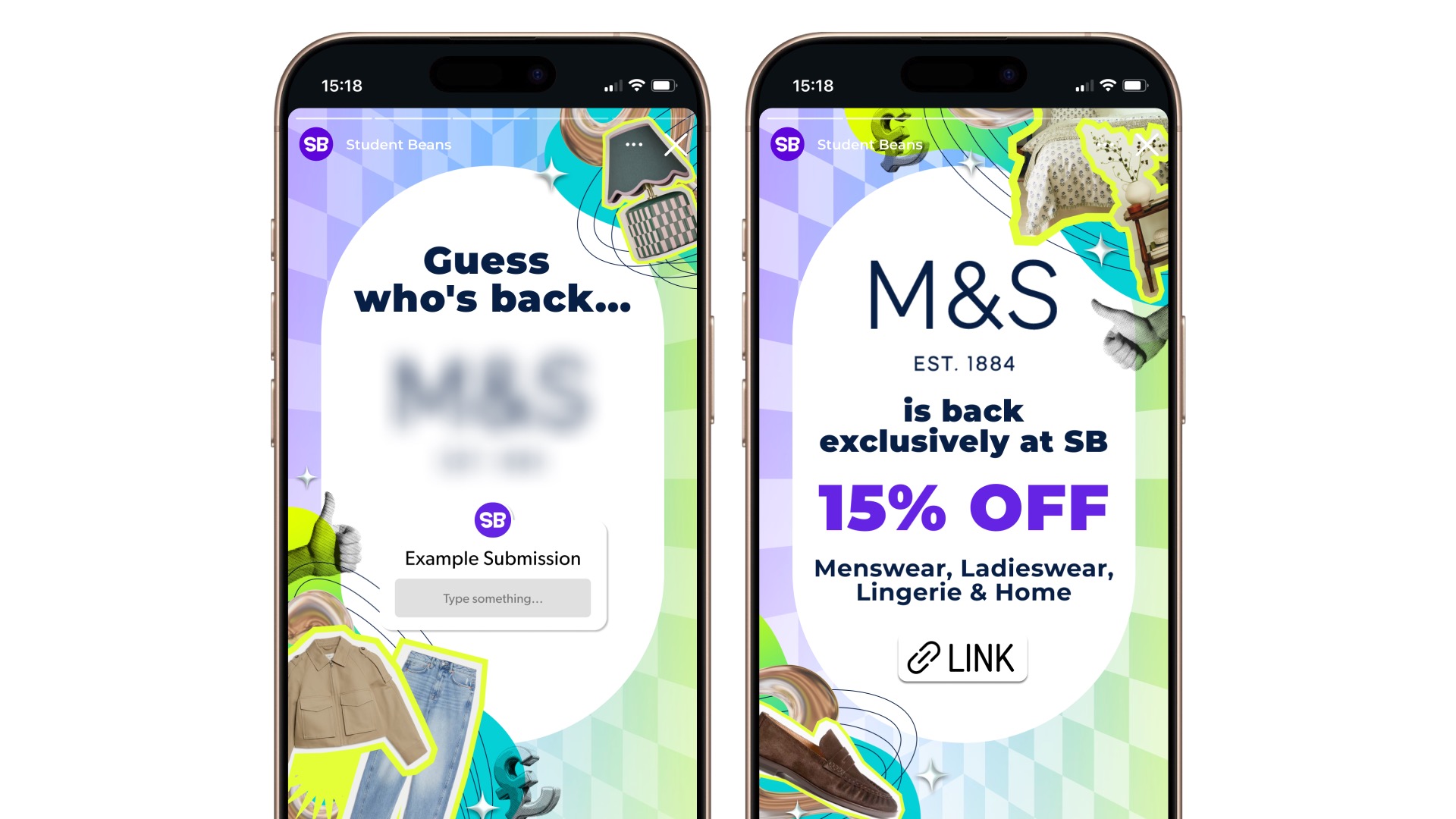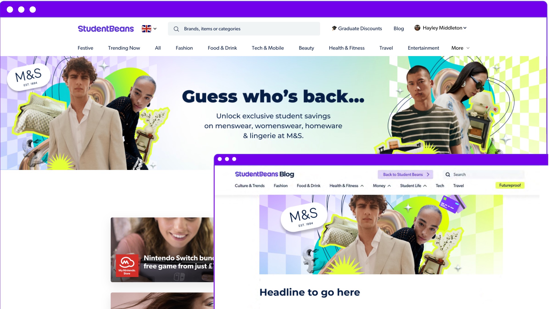Digital campaign assets for Student Beans' partnership with Marks & Spencer, featuring social media content and promotional designs.